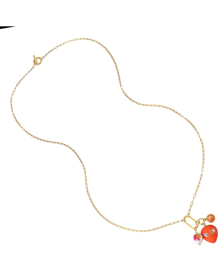 - Refined chain necklace featuring playful mixed charm pendants including; orange alien head, lustrous pearl with smiley yin yang and cabochon with minimal signature eagle head motif.