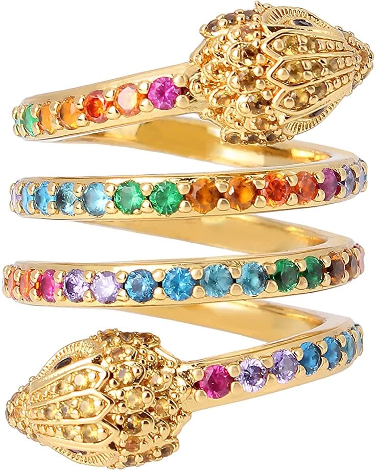 - Delicate coil ring adorned with vibrant rainbow-colored pave and signature eagle head motif hardware at either ends.