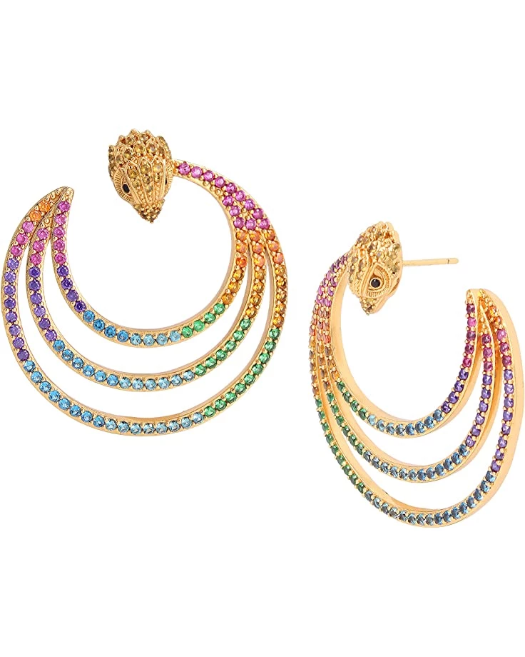 - Sleek spiral open hoop earrings adorned with vibrant multi-colored pave and signature eagle head motif at top.