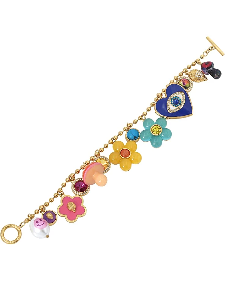 - Refined chain bracelet featuring novelty mixed charms at front including blue enamel heart with evil eye motif, flowers, mushrooms, stones and pearl with smiley face motif.