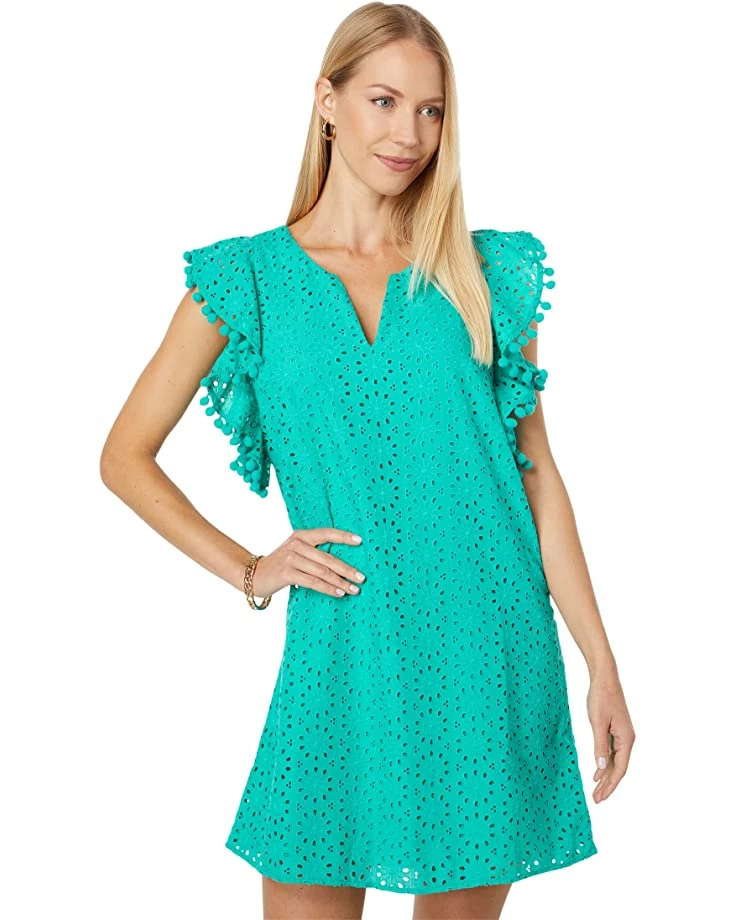 - With an allover decorative knit construction and ruffle cap sleeves featuring bobble accents, the Lilly Pulitzer® Astara Dress is a unique and fun above the knee dress perfect for your next lunch date.