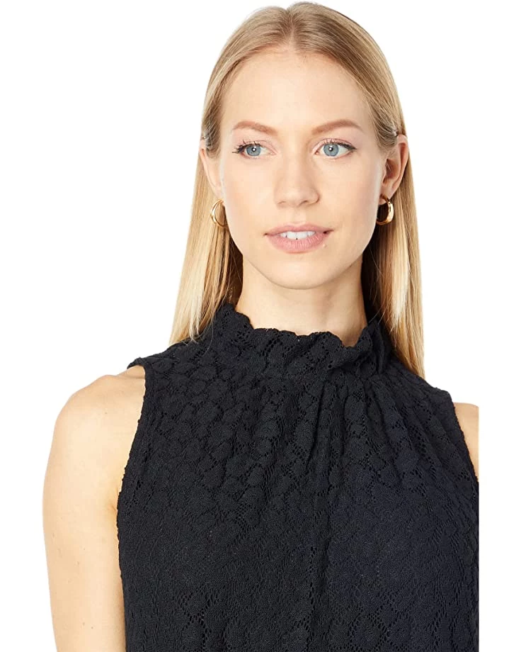 Definitely more stretchy the other LP dresses I have purchased. I like the lace detailing and the ruffle at the neck. Will be super easy to dress up or down!