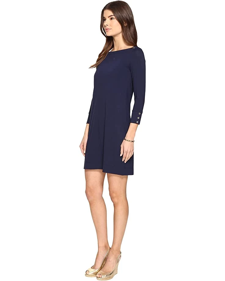 - Three-quarter sleeve dress in a solid stretch rayon jersey knit.