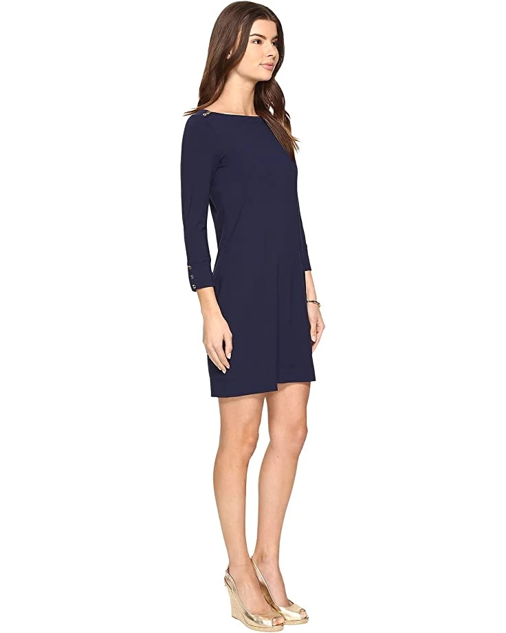 Fun shift dress; very comfortable. Clingy, but in the right places. I love the gold button details on the sleeves and shoulders. Really great dress, and I look forward to wearing it in the summer with the UPF 50+.