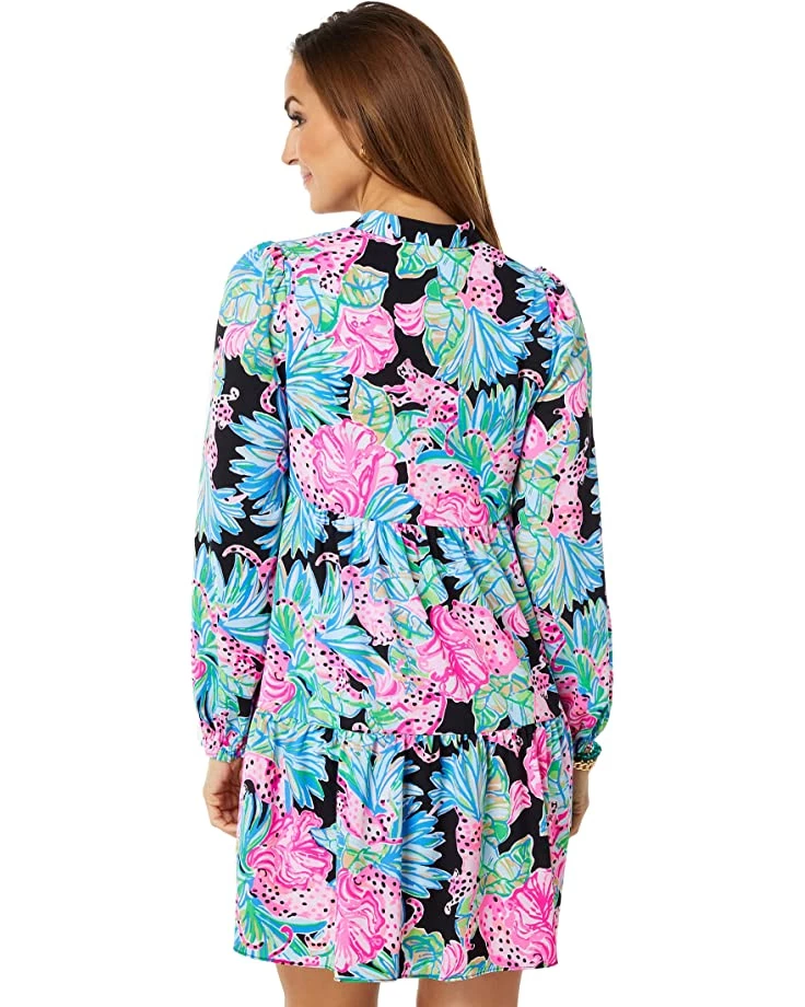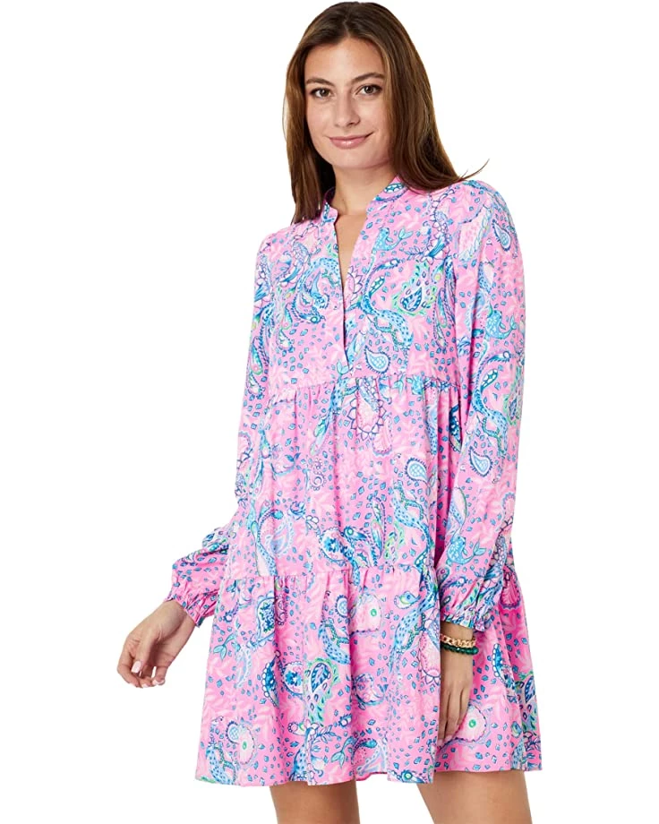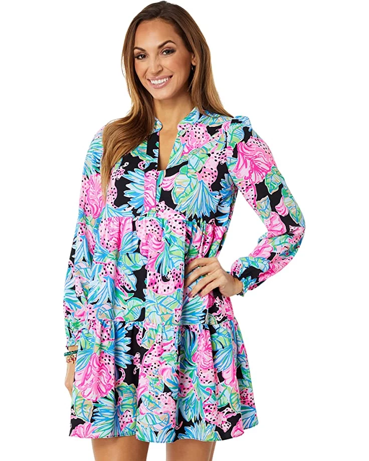 This dress is transition to fall perfection! It is beyond flattering, and the colors are stunning! I am an 8/M in most Lilly, and it fits true to size.