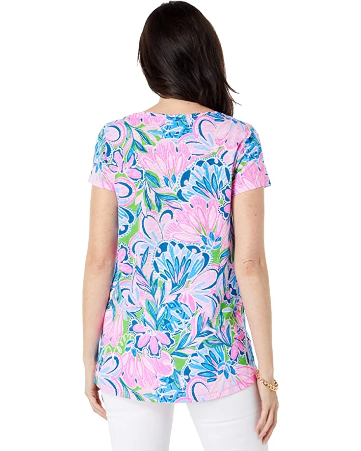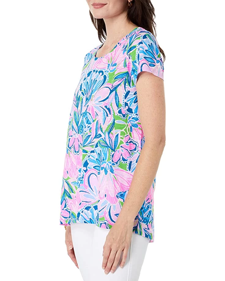 The colors are pretty, not as bright as on other Lilly shirts. I really like the length of the top, and the scoop neck as opposed to the v neck, but find the sleeves to be quite short, and wish they were a little longer but it’s a fun shirt!