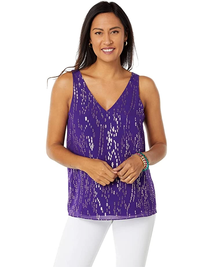- The Lilly Pulitzer® Florin Silk Sleeveless V-Neck tank will be the superstar of your closet! This comfortable and easy top is crafted with a two-layer design, and features metallic clip-dots for a hint of shine.