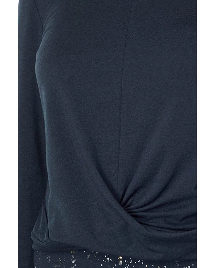 - Pullover design features rounded neckline, full-length sleeves, and twist detail at the lower front hem.
