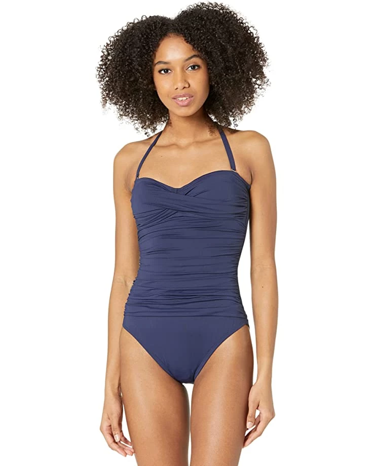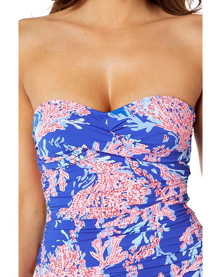 - Strapless one-piece swimsuit features twisting at the bust and shirring on the front torso for flattering texture.