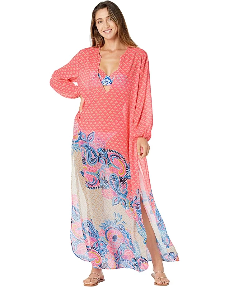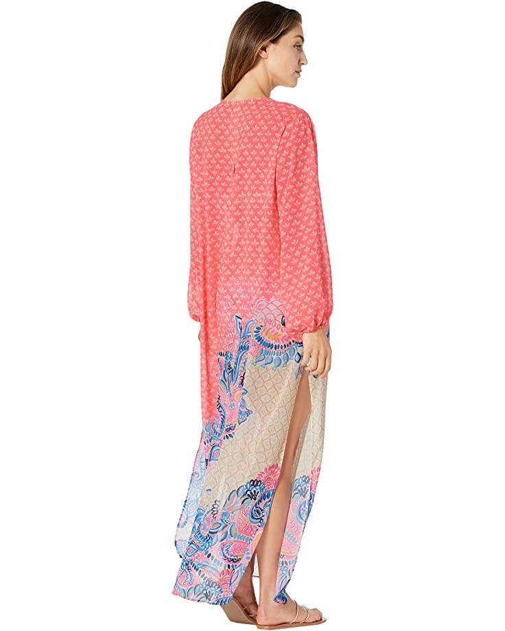 - Kick your feet up and relax with your favorite drink in the Lilly Pulitzer® Frey Cover-Up featuring a classic long sleeved cover up falling towards the ankles with slits for added style and free range of movement just incase you’d like to tan boasting all over paisley inspired pattern.