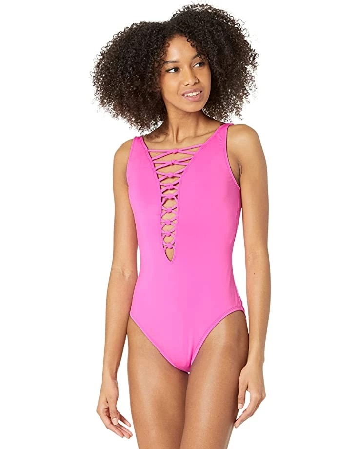 - Printed one-piece bathing suit features a plunge front and back with knotted lattice straps.